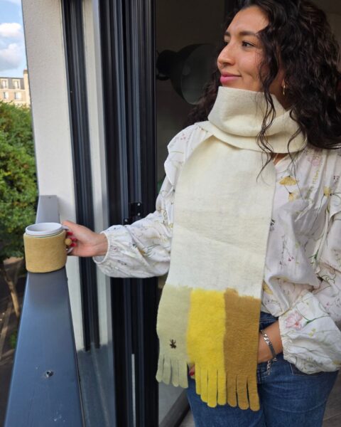 Restez au chaud tout l’hiver avec l’écharpe Terskey/Kungei ! Entièrement réalisée en feutre de laine naturel, cet accessoire vous protégera efficacement des caprices de la météo hivernale. Avec sa teinte beige naturelle et ses bandes aux couleurs vibrantes, elle incarne le style minimaliste et moderne imaginé par une coopérative de femmes artisanes du Kirghizistan.