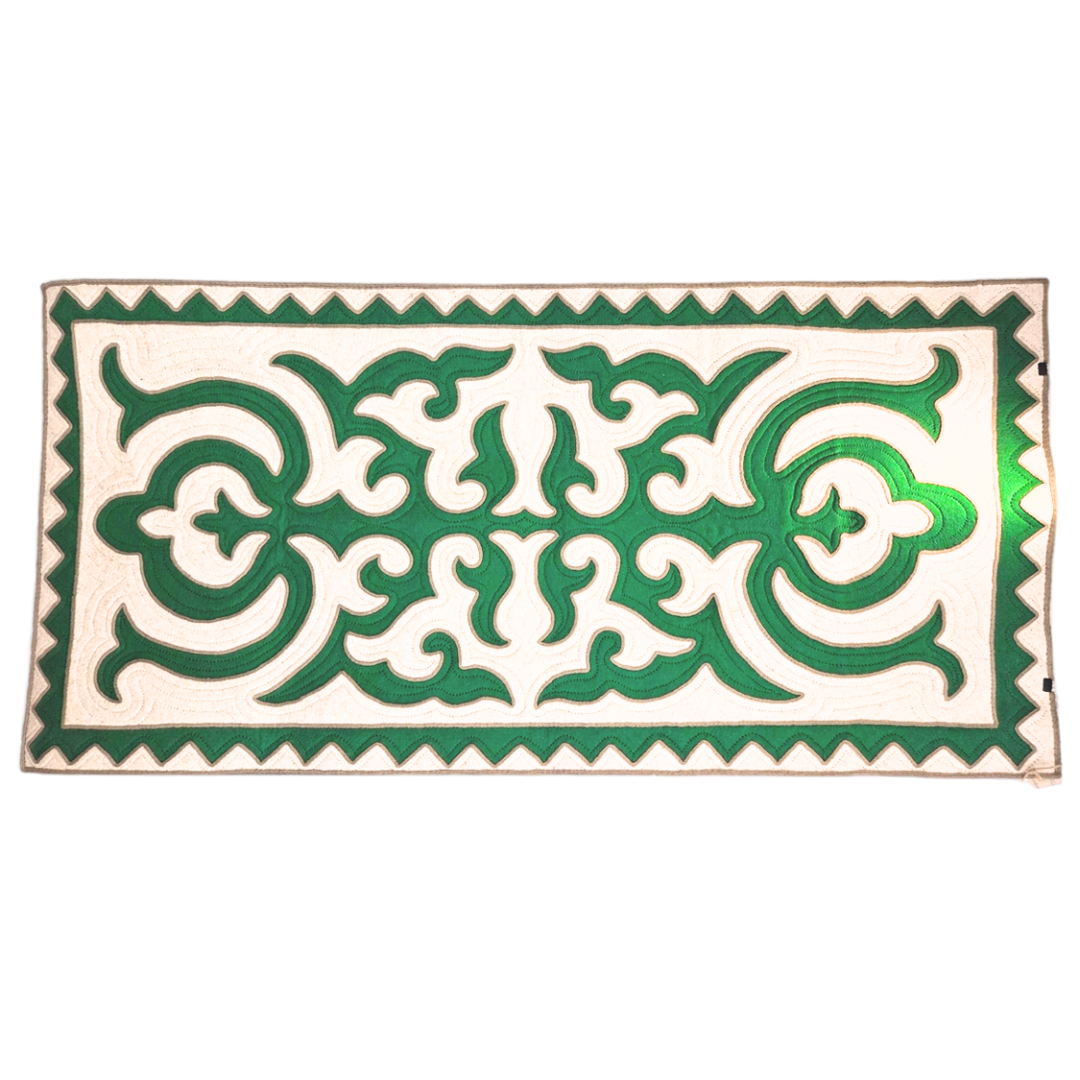 Le Shyrdak Estive s’inspire des grandes plaines kirghizes où la vie suit le rythme paisible de l’été nomade. Le vert intense de ses motifs dessine la grandeur des pâturages, riches et sauvages, tandis que le fond écru rappelle la douceur de la laine brute et la lumière vive des plateaux ensoleillés. Ce tapis est un hommage vibrant aux estives kirghizes, à la nature et à la liberté des grands espaces.