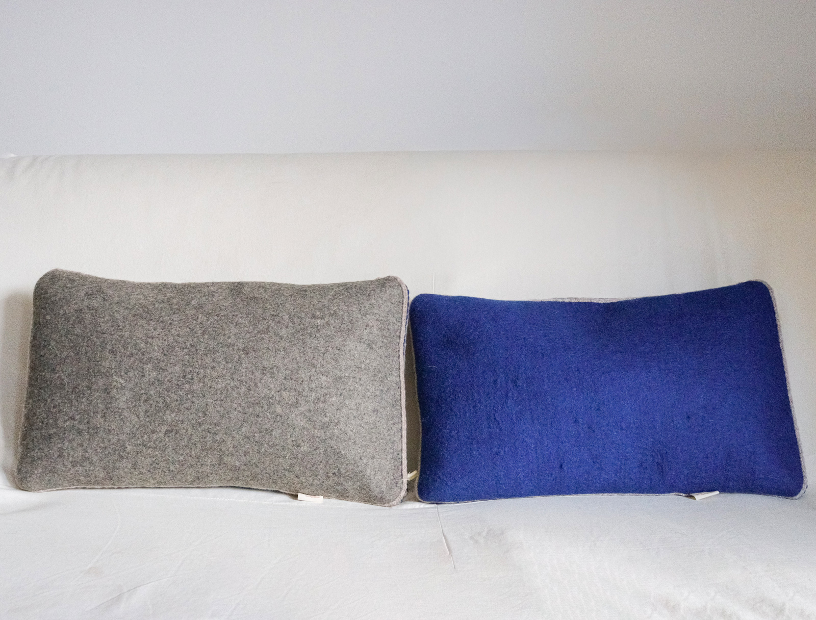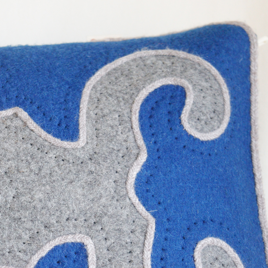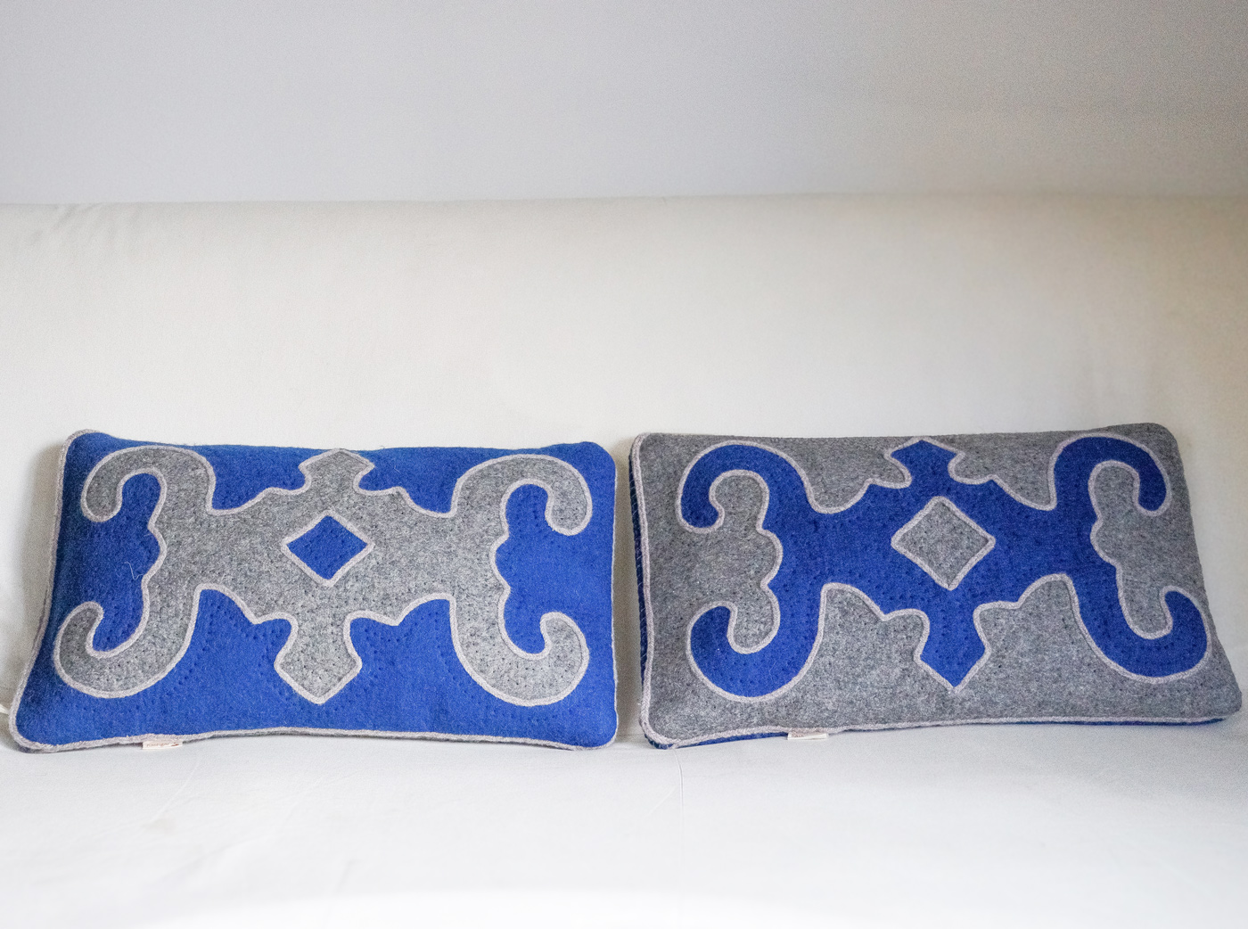 Housses de coussins découpées et brodées à la main. Conçu entièrement en feutre de laine artisanal et fils de laine, puis doublée en coton.