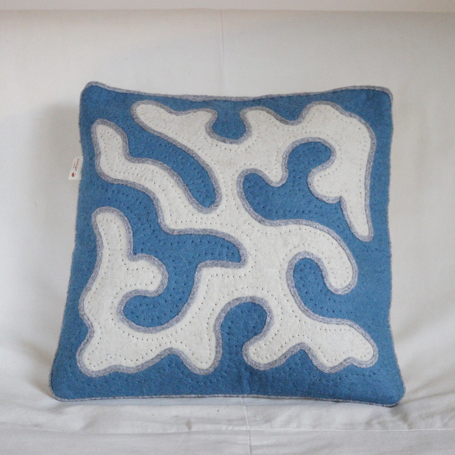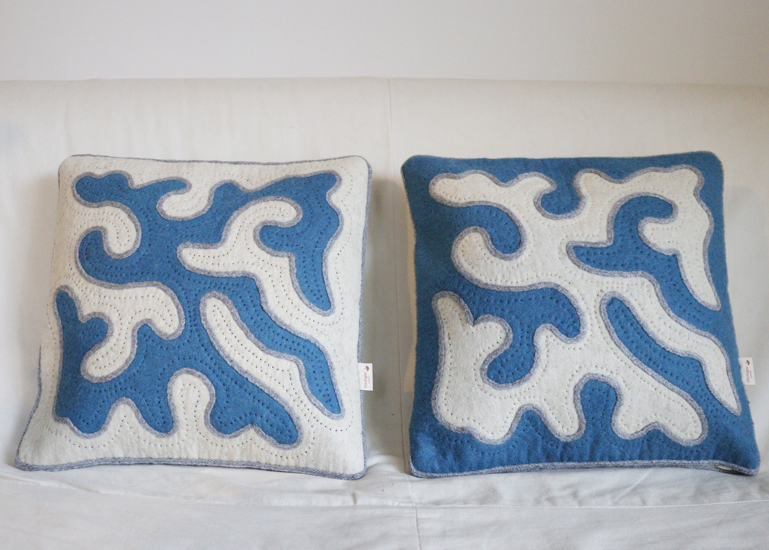 Housses de coussins découpées et brodées à la main. Conçu entièrement en feutre de laine artisanal et fils de laine, puis doublée en coton.