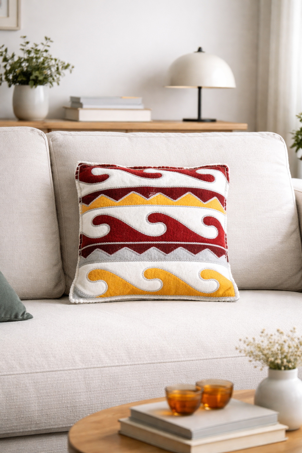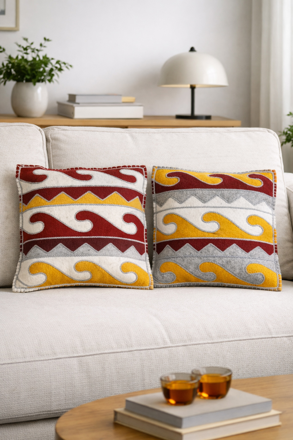 Inspirées de la technique ancestrale du tapis traditionnel Shyrdak, inscrite au patrimoine culturel immatériel de l’UNESCO, ces housses sont entièrement réalisées à la main. Chaque motif est découpé dans deux feutres de couleurs contrastées puis assemblé avec précision, créant des compositions inversées, complémentaires et uniques.