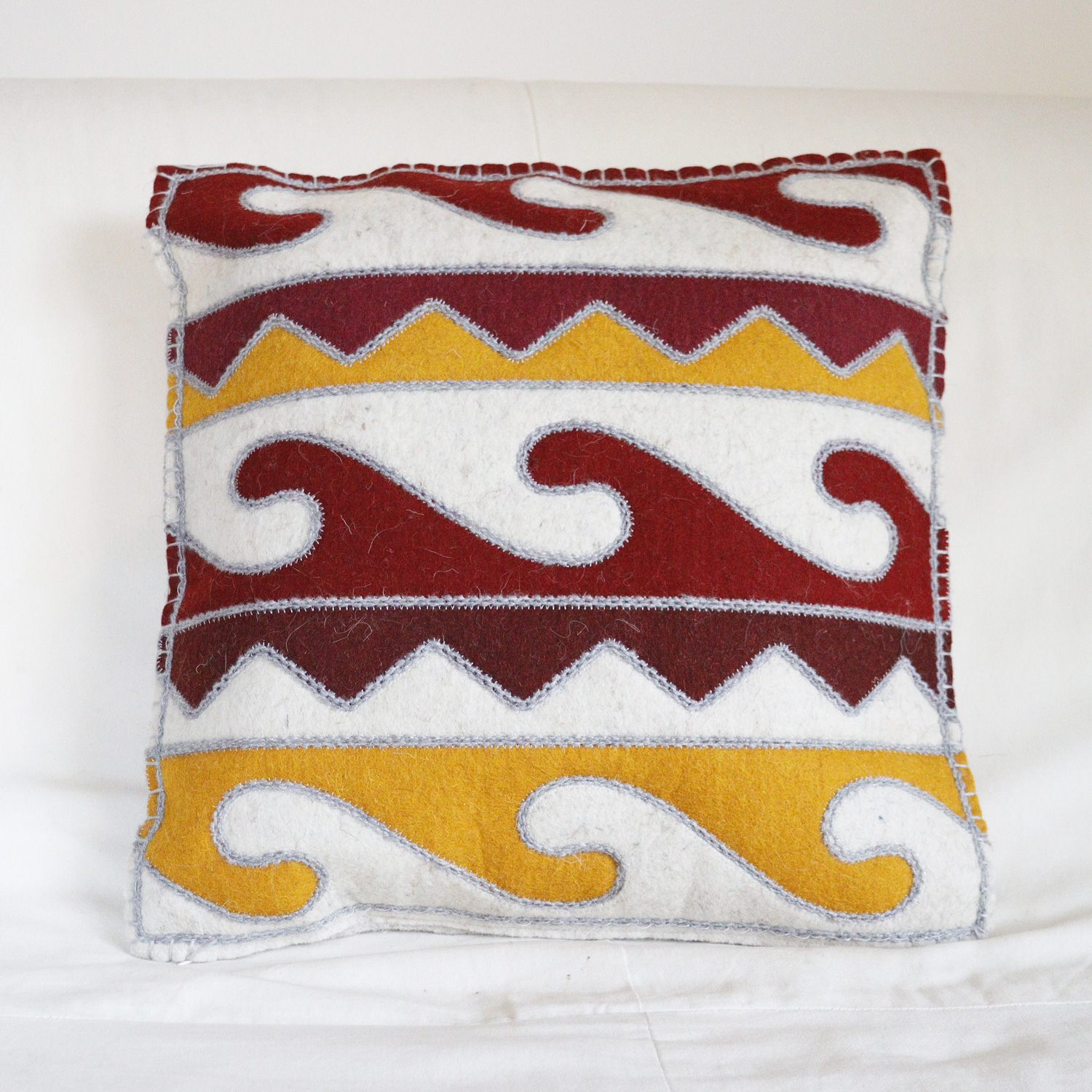 Housses de coussins découpées et brodées à la main. Conçu entièrement en feutre de laine artisanal et fils de laine, puis doublée en coton.