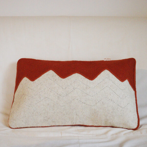 Cette création fusionne l’intensité du rouge garance et la douceur naturelle de la laine écrue.