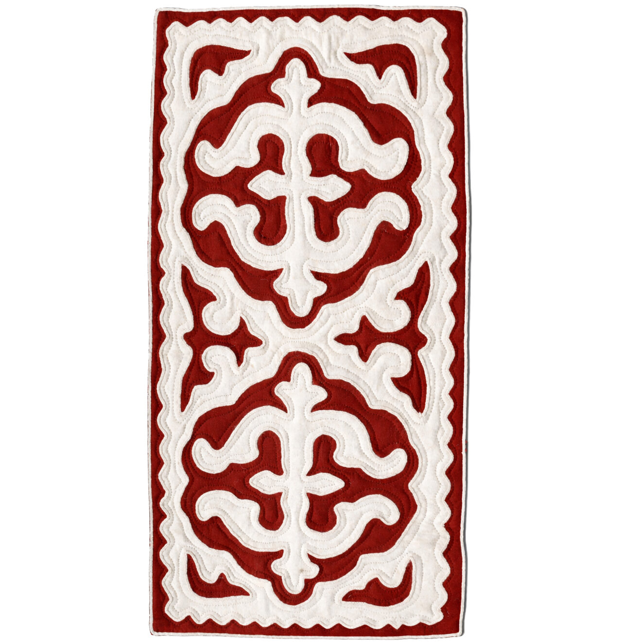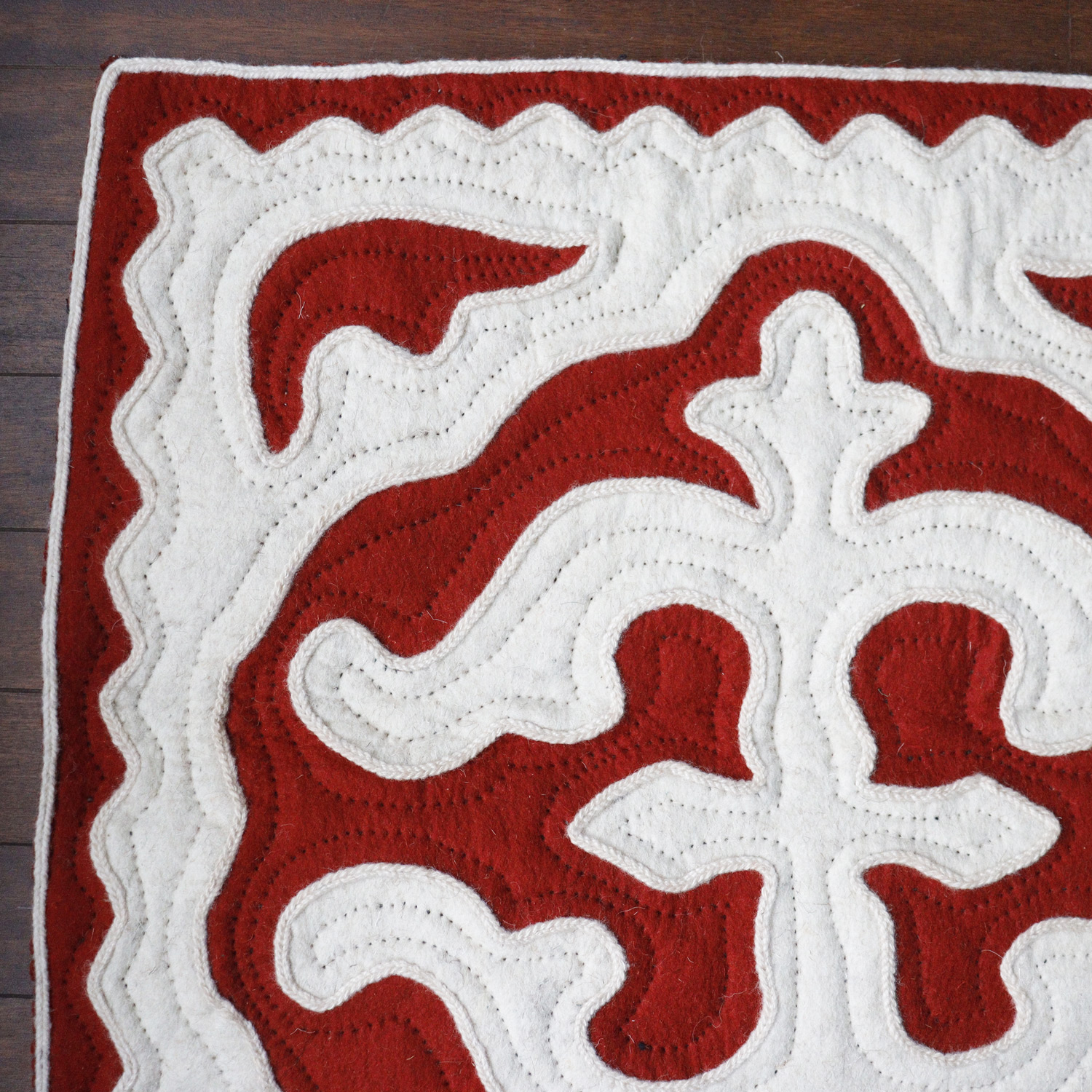 Ses motifs centraux, tels des tulipes de montagne, s’épanouissent au cœur du feutre pour symboliser le renouveau et la lumière.