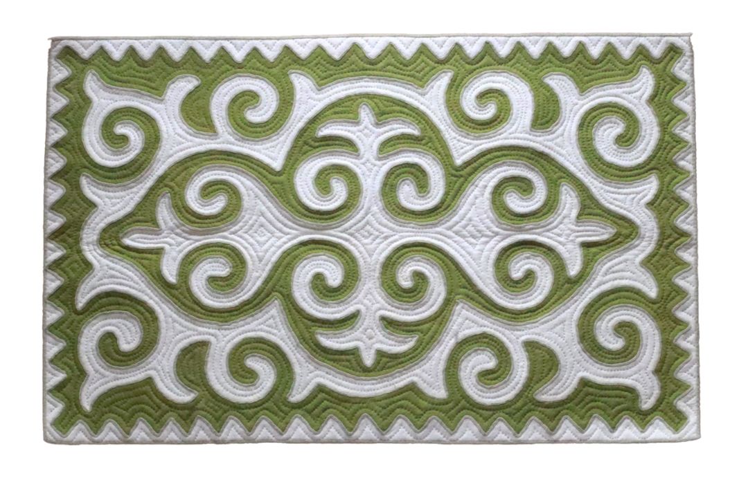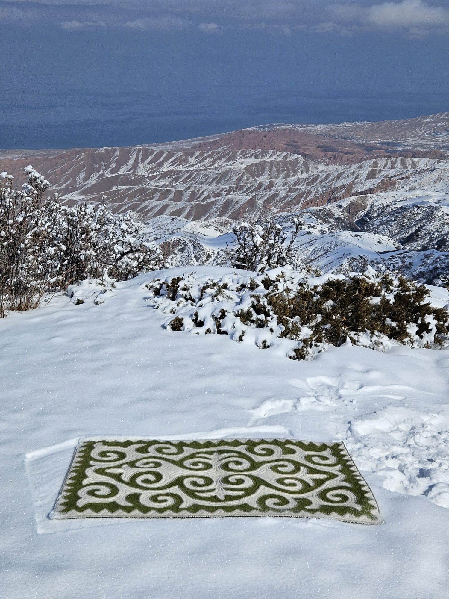 Les tons naturels et les motifs envoûtants du tapis Shyrdak « Sérénité » créent un espace apaisant et chaleureux, invitant à la détente et au ressourcement. La couleur verte ajoute une douceur qui évoque les riches pâturages d’été des hautes vallées perchées à 3 000 mètres d’altitude dans les monts célestes du Kirghizistan.